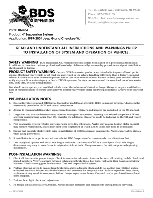 BDS steps up the performance and capability of the 1999-2004 Jeep Grand Cherokee WJ with a 4-inch suspension lift kit. Designed to improve stance this kit includes everything necessary to set your Jeep up right with clearance for up to 31 tires.The lift kit includes front BDS Pro-Ride Coil Springs, a heavy duty track bar relocation bracket and drop pitman arm that corrects steering geometry, transfer case drop kit to reduce drive line angles, and heavy duty adjustable lower control arms to allow you to adjust the axle rotation.The rear kit utilizes Glide-Ride coil springs for maximum travel, rear upper tri-link spacer, and extended sway bar links. Finish of the kit with your choice of specially tuned NX2 nitro series gas shocks or FOX 2.0 IFP performance series gas shocks to offer improved damper performance.Pro-Ride Coil SpringsA pair of full-length, Jeep-specific, Pro-Ride coil springs are supplied to provide the correct lift height and smooth, predictable ride across various terrains. Manufactured from high tensile steel, our direct OE replacement coil springs are engineered with properly sized wire diameter. This results in maximum reliability without premature coil bind.