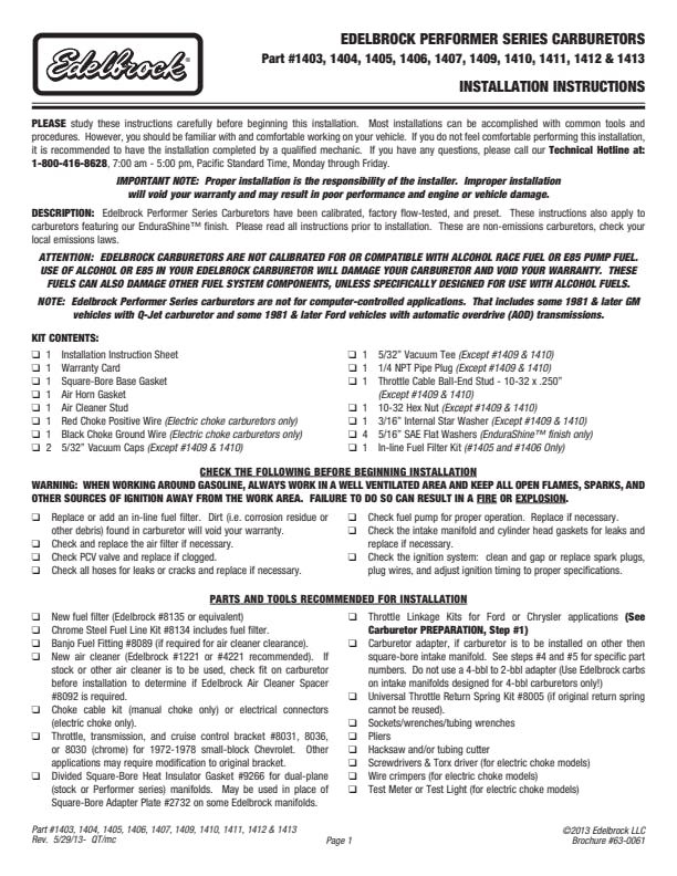 The Edelbrock 1411 Performer Series 750 CFM electric choke carburetor is a precisely tuned, quality-built carburetor that can handle the rigors of daily driving while delivering consistent, reliable street performance from day to day. Several characteristics make the 1411 Performer Series 750 CFM electric choke carburetor an outstanding street performer. The first one is that metering rods are utilized to transition between circuits. The carburetor is unaffected by engine backfires, which means that there are no power valves to blow out, and the rods can be changed in seconds without carburetor removal or fuel draining. Secondly, the carburetor has the unique ability to "hold a tune", so once it is tuned, the carburetor stay's tuned. What this means to you is that compared to other carburetors, the performance remains consistent and the calibration stays unchanged. The lightweight all-aluminum body features a two-piece body that resists warping and is compatible with gasohol and blended fuels. The simple tub-type bowls and rear-pivot floats all contribute to a carburetor that's reliable, user-friendly and is easily tunable for miles and miles of trouble-free operation.
