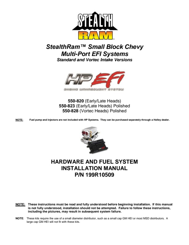 The following sensors are included: TPS - IAC - MAP - CTS - MAT - Wideband O2 ECU is certified to ISO 8846, SAE J1171 & United States Coast Guard Requirements for Ignition Protection & Fire Resistance. Holley HP EFI systems are equipped with 4 programmable inputs and 4 programmable outputs that are ideal for most vehicles with a single power adder. This feature allows the user to configure the system to support a wide range of controls including boost control, progressive nitrous, water/meth injection, speed inputs, fuel pump control, AC inputs, timing retard inputs and various other uses. When selecting an ECU, users need to ensure their planned controls can be run with the 4 inputs and 4 outputs as certain combinations may use more I/Os than are available. If more I/Os are required, users should choose the Dominator VMS. These kits require the use of a small diameter distributor, such as a small cap GM HEI or most MSD distributors. A large cap GM HEI will not fit with these kits.Software and firmware updates can be downloaded here for free.