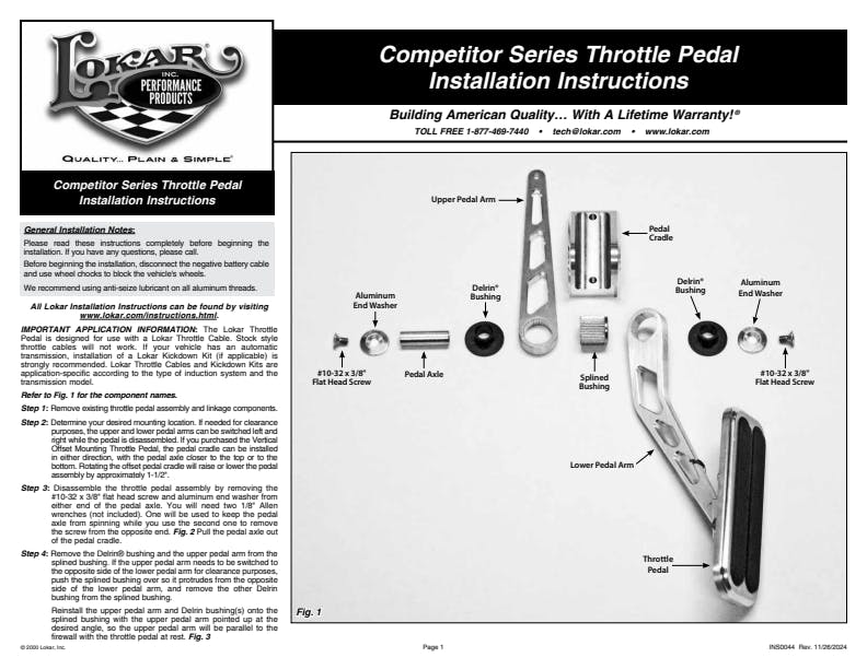 Lokar's Competitor Series Throttle Assemblies are designed with a unique internal spanner nut ensuring perfect pedal tension. This pedal is in a class of its own. By adding this built in tensioning feature, we have eliminated the possibility of excess ‘slop' in the throttle pedal. Another milestone of the Competitor Series Throttle Pedal is its incredibly sturdy mounting base. The design of this pedal has enabled us to provide over an 1-1/4 in. wide mounting base yet maintain a narrow and sleek appearance. If that weren't enough, the mounting base is available in either a centered or an offset version which will raise or lower the center of the throttle assembly an entire in.. This feature is incredibly accommodating when installing the pedal in a vehicle which already has the throttle cable installed. We have also built the Competitor Series Throttle Assemblies with our exclusive large diameter 3/4 in.-48 tooth fine-spline steel insert to provide ultimate strength and durability. This also allows for infinitely adjustable arms which can also be swapped for right and left adjustment of the throttle pad. All of these features coupled with a spring-loaded throttle pad, Delrin(R) All of these features coupled with a spring-loaded throttle pad, Delrin(R) Pedal the finest and most versatile throttle pedal available.